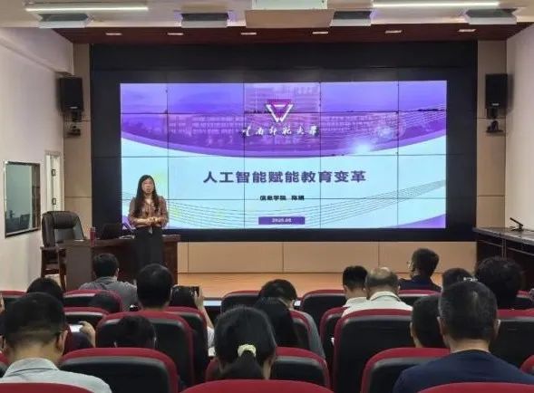 团队成员陈娟老师以“人工智能赋能教育变革”为主题,深入剖析了人工智能赋能教学环节、重塑教育生态带来的深远影响,全面解读了教育数字化转型中国家人工智能教育的政策体系建设与推进路径。同时,对人工智能发展对各行各业带来的冲击与挑战、人工智能环境下教与学的定位及教师的角色转型等作了深入阐述,并以国内主流AI工具为载体,通过多个中小学教学场景案例,演示了AI在文字处理、图片设计、音频制作、视频编辑等全流程教学环节中的应用。最后,通过解读《中小学人工智能通识教育指南(2025版)》和《中小员工成式人工智能使用指南(2025版)》,对人工智能在各学段教育的应用规范、应用场景以及可能带来的风险及问题解决、AI时代教育发展的思考提出建议,为基础教育落实人工智能赋能教育高质量发展指出路径。
