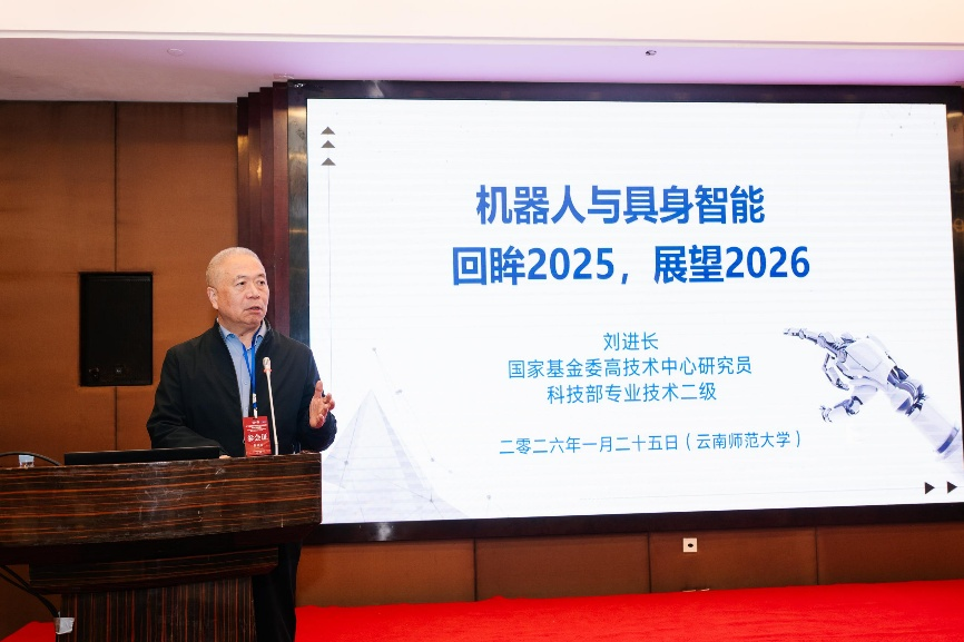 国家自然科学基金委高技术研究发展中心研究员刘进长作题为《机器人与具身智能》。报告回顾了2025年具身智能“量产元年”的技术飞跃,客观审视了行业落地面临的挑战,并对2026年人形机器人在政策与资本双重加持下的规模化、智能化发展进行了前瞻性预测,引发了现场对具身智能教育应用的深层思考。